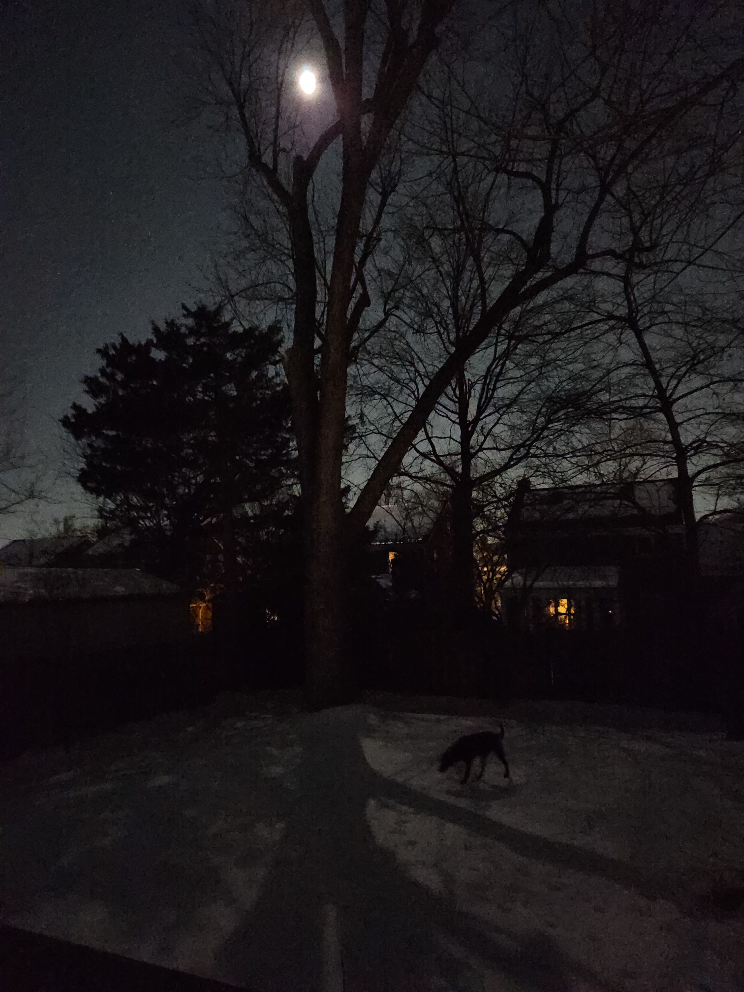 Chris Crosby, an Alexandria resident who says she is “seven decades old,” sent in this pic she took earlier this month of Moses, her black lab mix, in her ice and-snow-covered back yard in the pre-dawn moonlight.