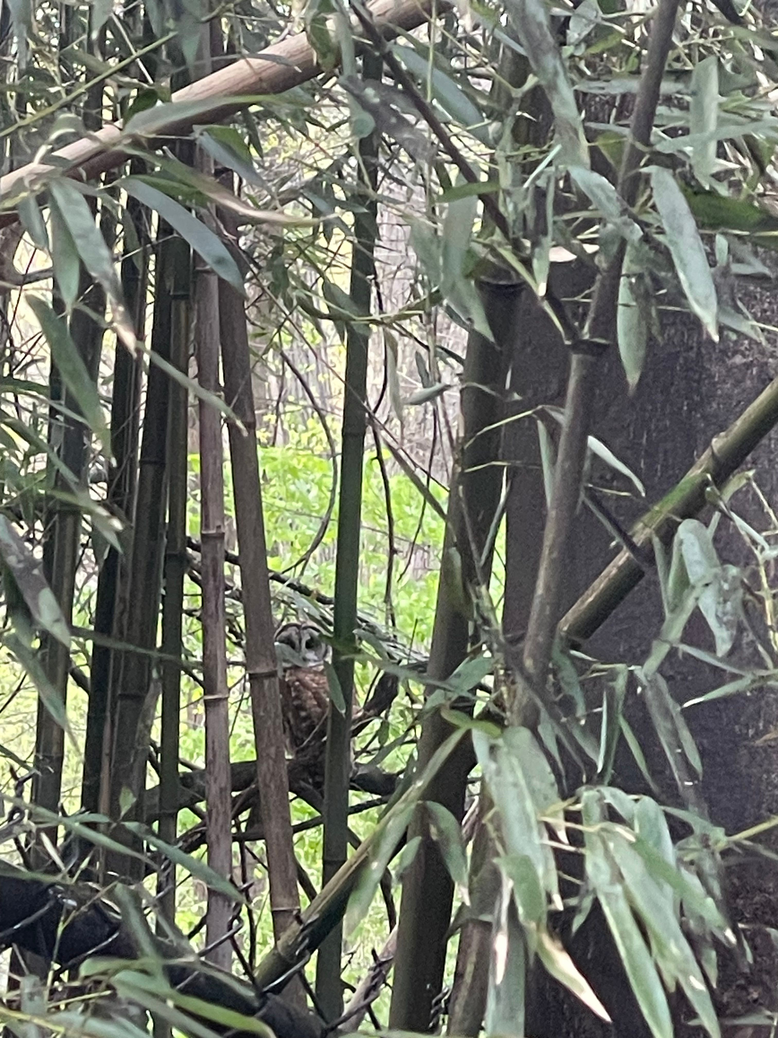 “Last week while taking my dogs out, I heard and saw a bird swooping downwards in the bamboo next to our home. I paused and my patience paid off as I observed him (or her) hop to another branch in an unmistakable owlish manner … Nearly every morning since, we’ve set into a pattern. I walk out the side door, he hears us, and swoops down to a lower spot in the trees,” Samantha wrote me in an email.